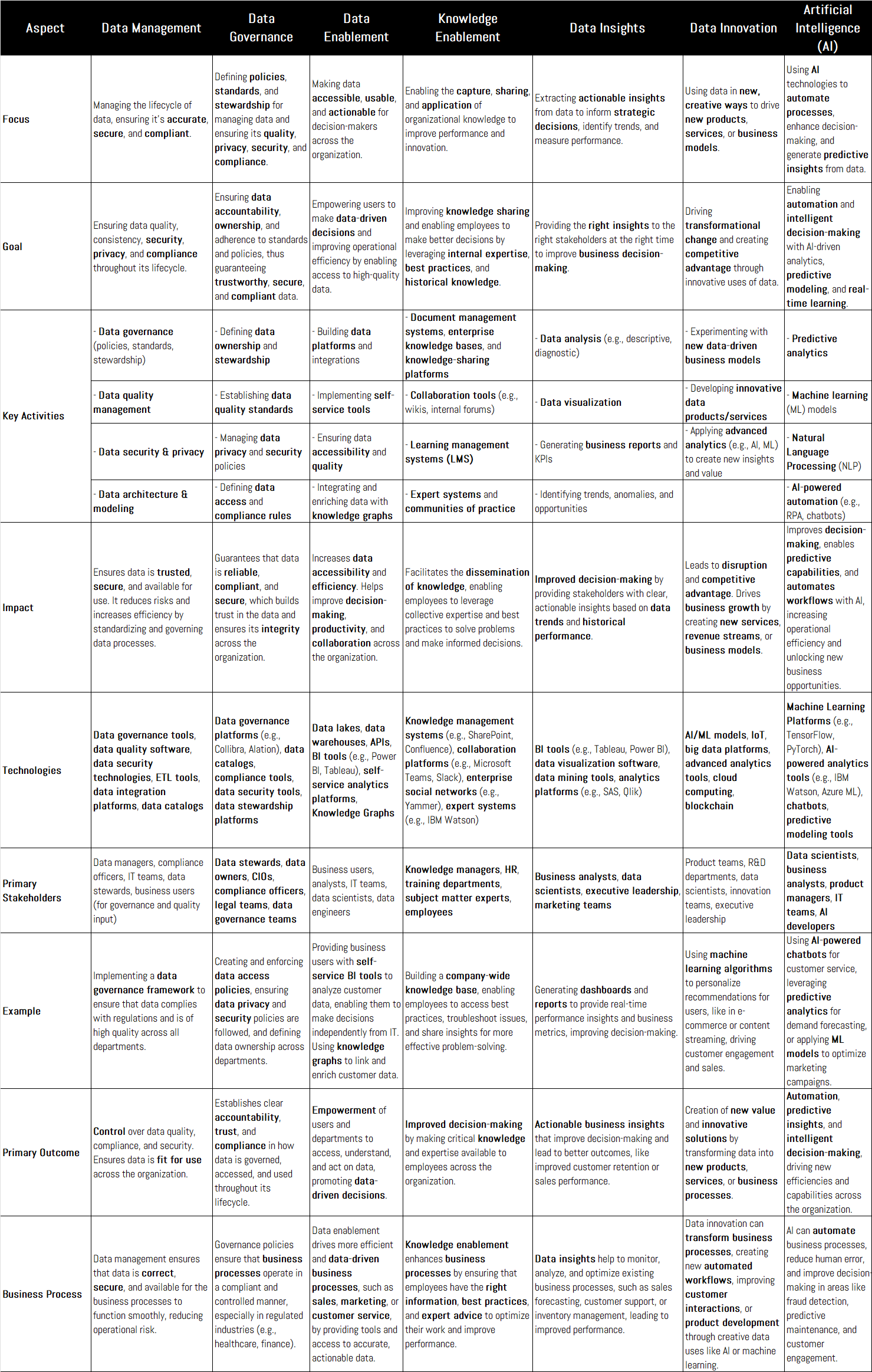 The misconception is that Data Governance manages these functions. Data Governance defines policies, standards, and stewardship for managing data and ensuring its quality, privacy, security, and compliance. In contrast, Data Enablement makes data accessible, usable, and actionable for decision-makers across the organization. Knowledge Enablement, on the other hand, facilitates the capture, sharing, and application of organizational knowledge to improve performance and innovation.